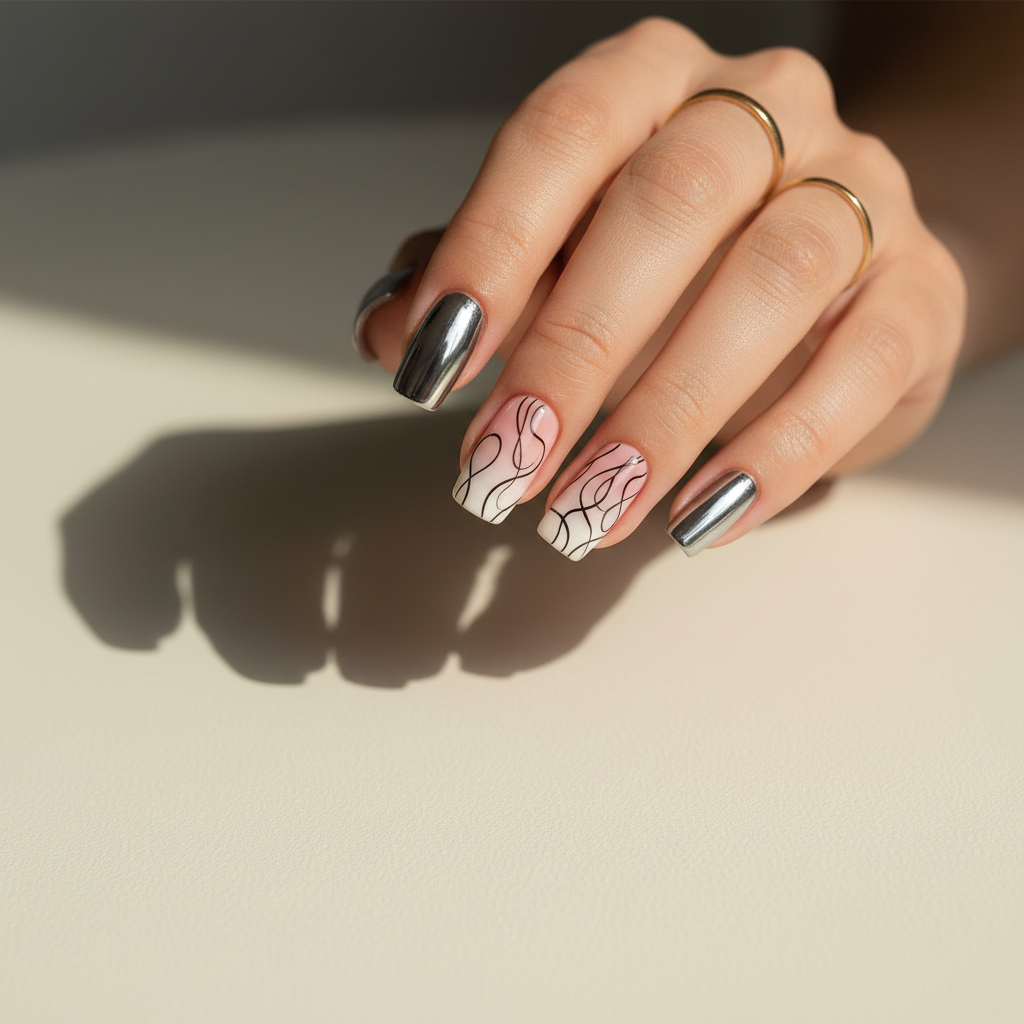 Solid color plus accent nails, chrome, or light design. Balanced and versatile.
